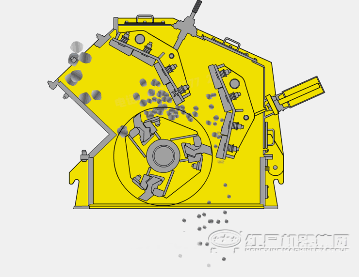 工作時,轉(zhuǎn)子由電動機經(jīng)三角皮帶傳動作固定方向旋轉(zhuǎn),在其機體上面懸掛著一組反擊板,活性石灰由裝料口,經(jīng)進料導(dǎo)板落入轉(zhuǎn)子上,被固定在轉(zhuǎn)子上的板錘打擊到反擊板上,再從反擊板上落下與轉(zhuǎn)子連續(xù)打上去的活性石灰塊互相沖擊,因此活性石灰塊在反擊板、轉(zhuǎn)子、導(dǎo)板、鏈幕之間所形成的破碎腔內(nèi),周而復(fù)始的反復(fù)運動,而產(chǎn)生強烈的沖擊現(xiàn)象,活性石灰塊沿其自然裂縫或凹陷破碎,從排料口排出。